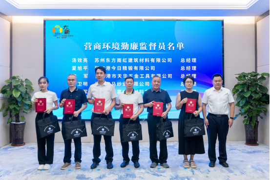 為切實加強營商環境監督,前期,鎮紀委通過組織推薦、個人自薦的形式,選聘了6名營商環境勤廉監督員,他們是:蘇州東方雨虹建筑材料有限公司總經理湯效亮,張家港今日精鍛有限公司總經理夏旭平,張家港市天華五金工具有限公司總經理李軍,江蘇宏馬紗業有限公司總經理茅衛明,張家港市天優機械有限公司總經理黃平,張家港市大新鎮格蘭朵化妝品店負責人周亞靜。下面,有請各位監督員上臺,同時,有請大新鎮黨委委員、紀委書記王志清為他們頒發聘書并贈送“親清”禮包,有請王委員!