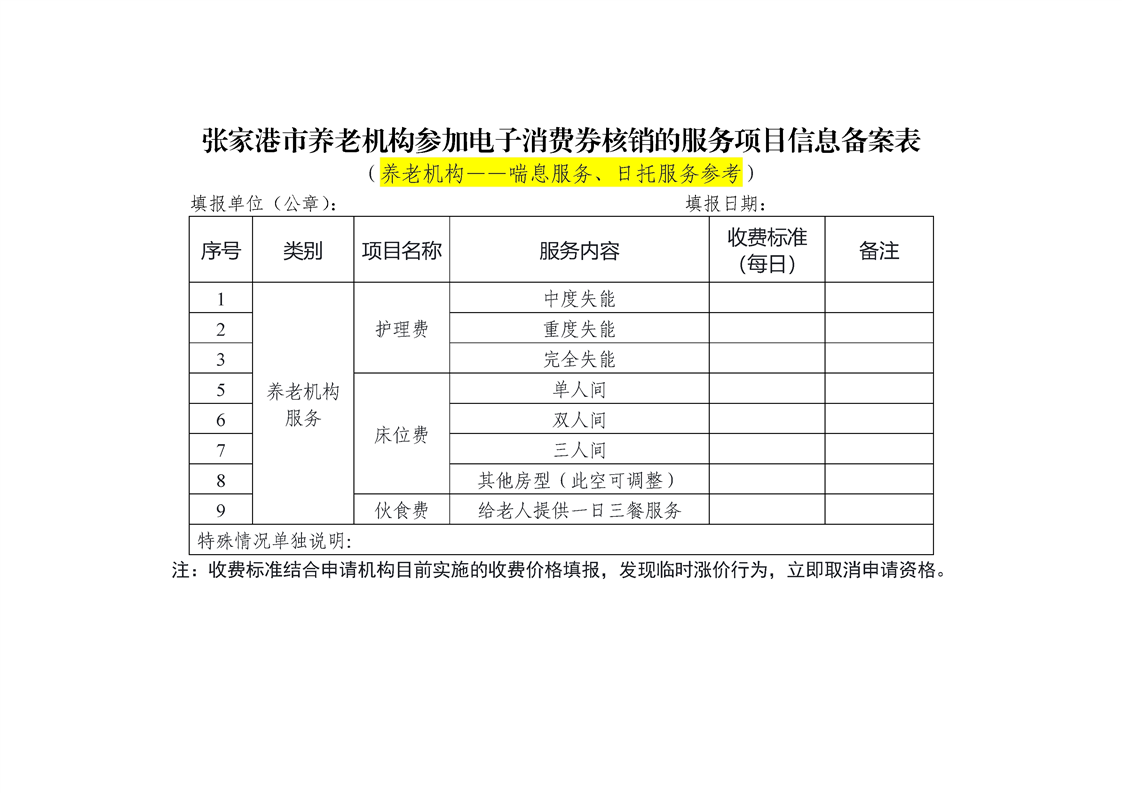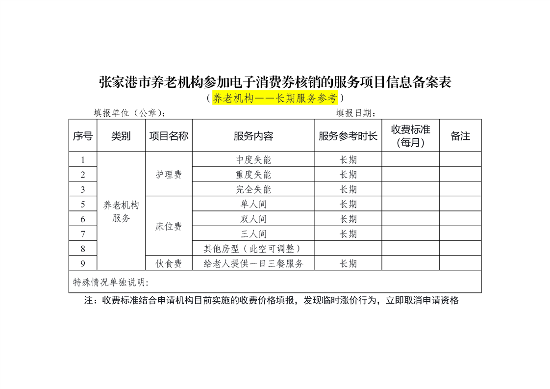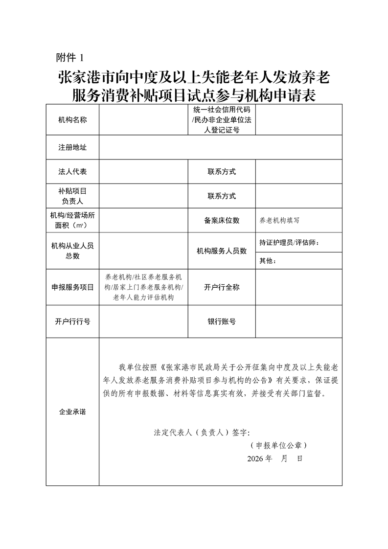 1.張家港市向中度及以上失能老年人發(fā)放養(yǎng)老服務(wù)消費(fèi)補(bǔ)貼項(xiàng)目參與機(jī)構(gòu)申請(qǐng)表(附件1);