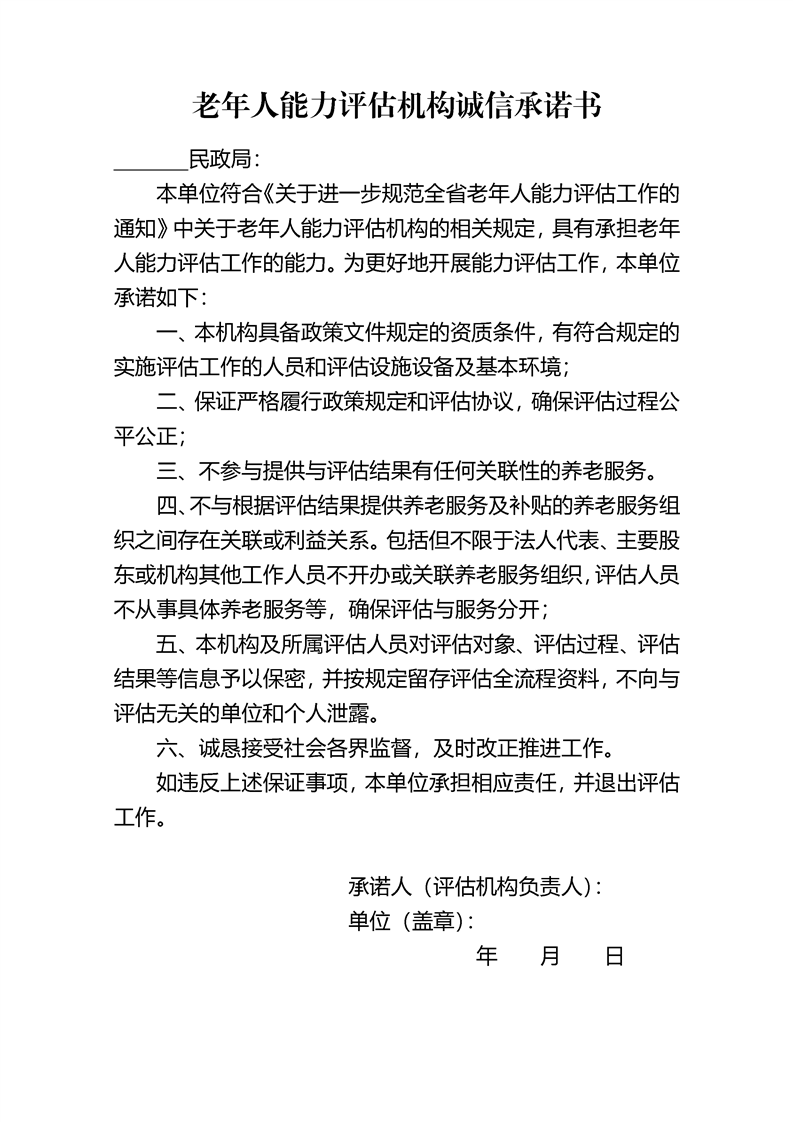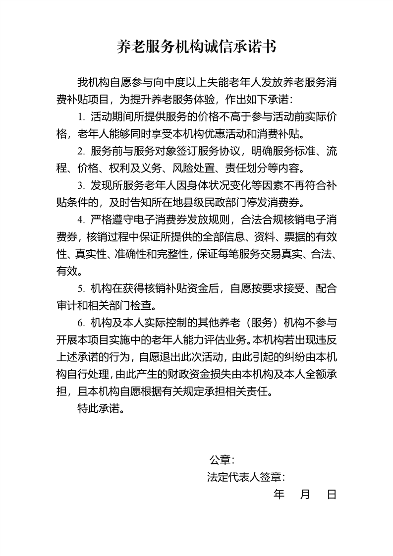 3.能夠獨(dú)立開展老年人能力評(píng)估工作,無《江蘇省養(yǎng)老服務(wù)市場(chǎng)失信聯(lián)合懲戒對(duì)象名單管理實(shí)施辦法》中明確的名單列入以及其他失信、違規(guī)違法等情形;