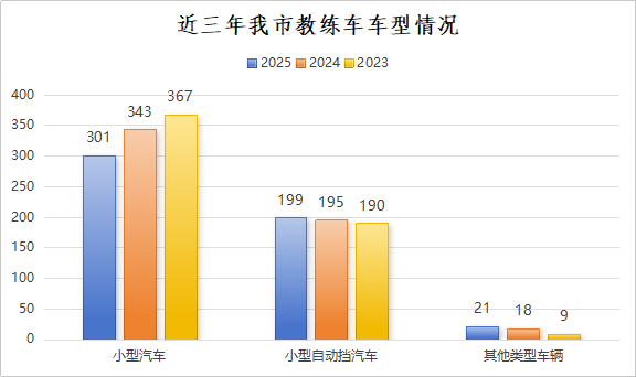 2025年,我市備案教練車521輛,較2024年減少35輛。按車輛類型劃分,其中小型汽車500輛,占比95.97%(其中手動(dòng)擋小型汽車301輛,自動(dòng)擋小型汽車199輛);其它類型教練車21輛,占比4.03%。