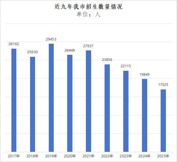 根據(jù)《中華人民共和國勞動(dòng)法》、《中華人民共和國道路運(yùn)輸條例》和《機(jī)動(dòng)車駕駛培訓(xùn)教學(xué)與考試大綱》規(guī)定,我市現(xiàn)有駕校最大培訓(xùn)供給能力約為3.6萬人次/年,但2025年實(shí)際開班學(xué)員僅為1.7萬人。近年來,我市招生數(shù)量呈逐年下滑趨勢(shì),2025年更是跌至近九年來的最低值。