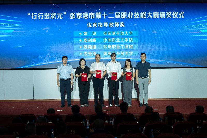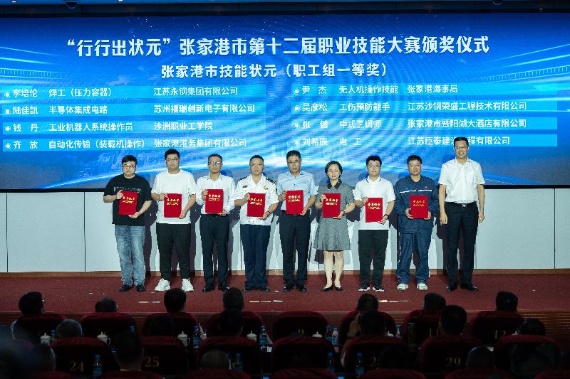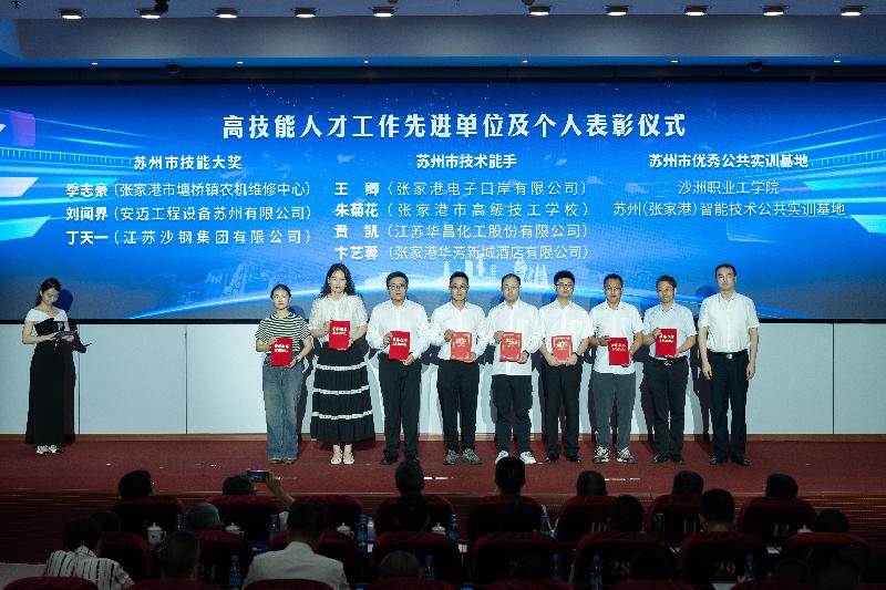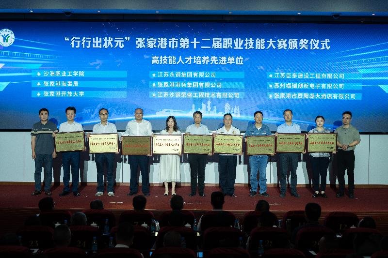 蘇州市人社局培訓指導中心主任浦彬,張家港市總工會副主席范穎飛為“行行出狀元”張家港市第十二屆職業(yè)技能大賽高技能人才培養(yǎng)先進單位沙洲職業(yè)工學院、張家港海事局、張家港開放大學、江蘇永鋼集團有限公司、張家港港務集團有限公司、江蘇沙鋼榮盛工程技術(shù)有限公司、江蘇臣泰建設工程有限公司、蘇州福瑞創(chuàng)新電子有限公司、張家港市暨陽湖大酒店有限公司代表頒獎。