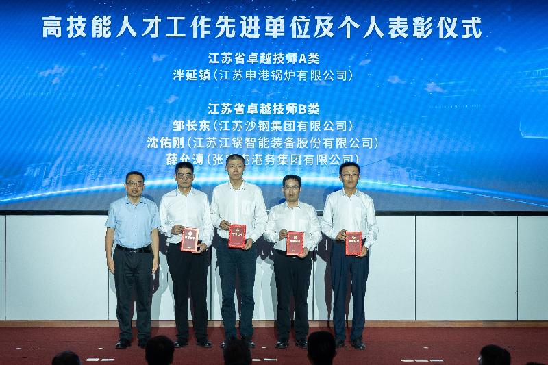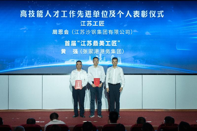 會上,張斌峰為江蘇技能大獎(江蘇工匠)周恩會、首屆江蘇最美工匠黃強頒發(fā)證書。