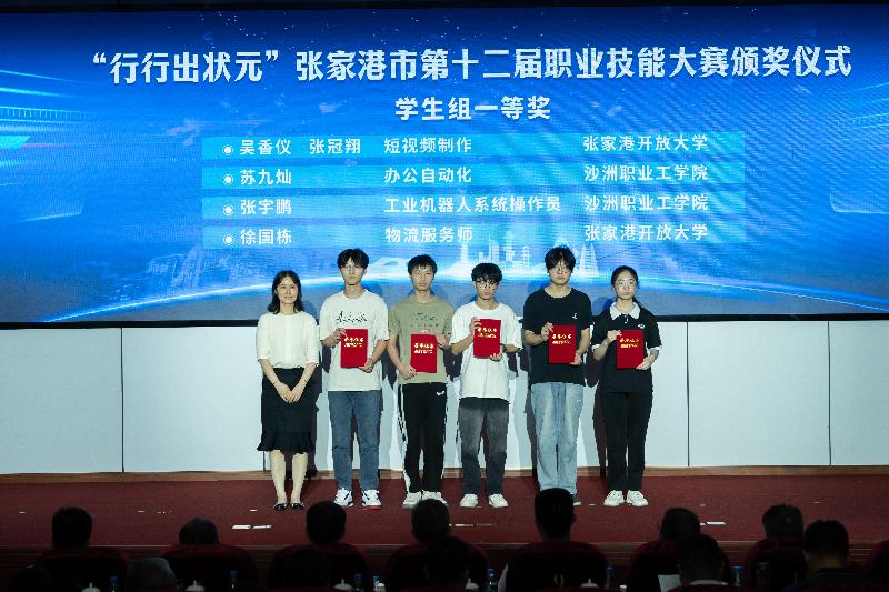 蘇州市人社局職業(yè)能力建設處(技工教研室)副主任吳佳為“行行出狀元”張家港市第十二屆職業(yè)技能大賽學生組一等獎獲獎選手吳香儀、張冠翔、蘇九燦、張宇鵬、徐國棟頒獎。