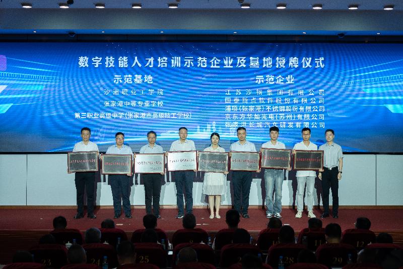 市委黨建辦副主任陶紀元為數(shù)字技能人才培訓示范企業(yè)和基地獲得單位江蘇沙鋼集團有限公司、國泰新點軟件股份有限公司、浦項(張家港)不銹鋼股份有限公司、京東方華燦光電(蘇州)有限公司、張家港長城汽車研發(fā)有限公司、沙洲職業(yè)工學院、張家港中等專業(yè)學校、第三職業(yè)高級中學(張家港市高級技工學校)代表頒獎。