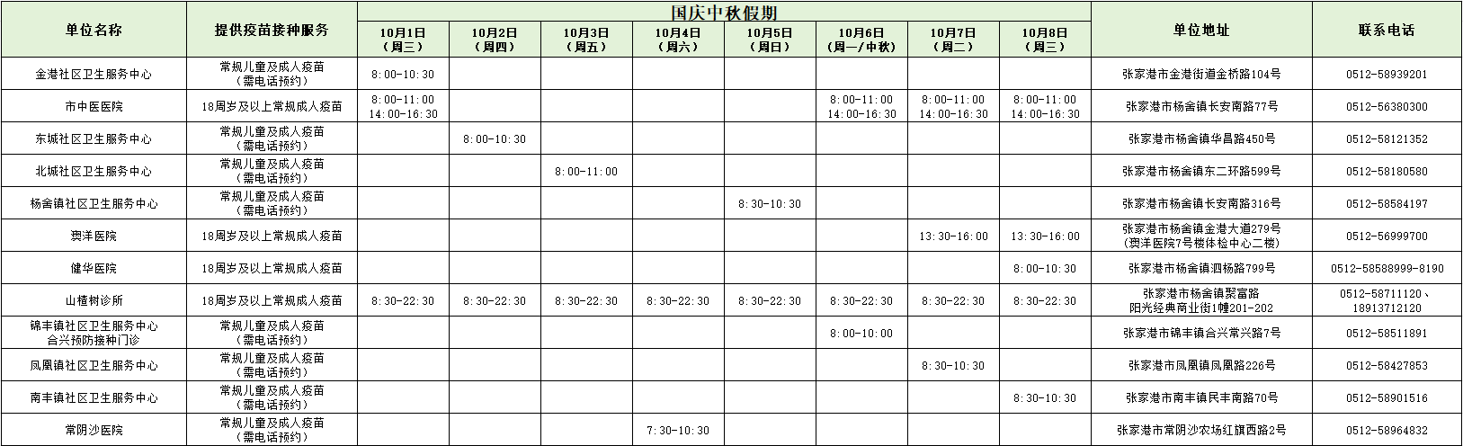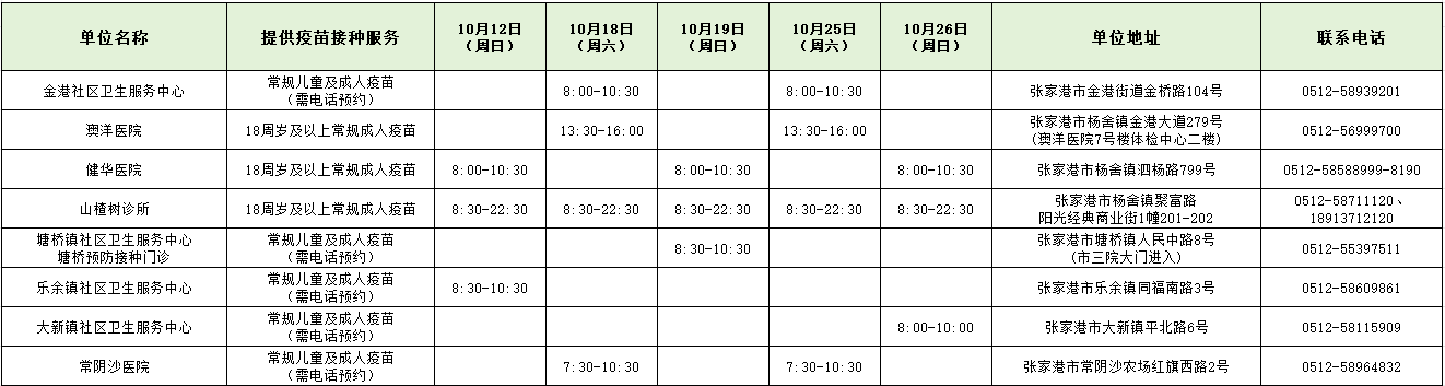 為方便市民接種疫苗,十月周六、周日及國慶中秋假期預防接種門診輪流加開常規兒童及成人疫苗接種專場(具體開診情況見下方表格,部分開診單位需電話預約),有需要的市民可前往接種。