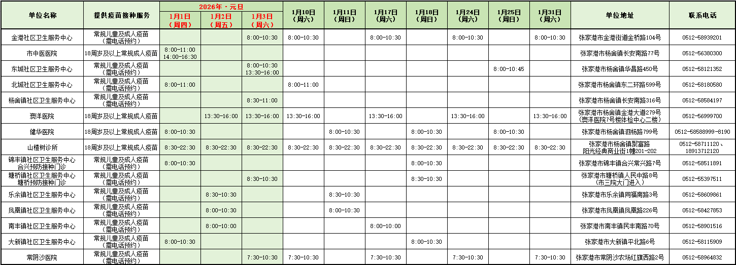為方便市民接種疫苗,元旦假期及一月周末預防接種門診輪流加開常規兒童及成人疫苗接種專場(具體開診情況見下方表格,部分開診單位需電話預約),有需要的市民可前往接種。