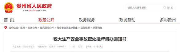 近日,貴州省人民政府網站發布《較大生產安全事故查處掛牌督辦通知書》。
