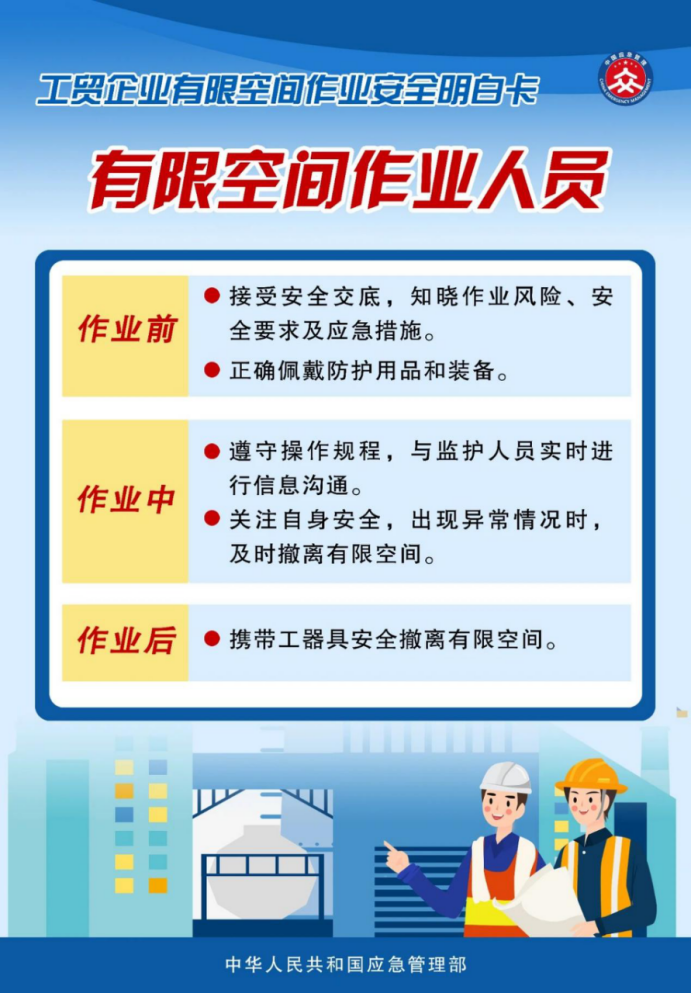 中毒和窒息事故在有限空間作業中比較常見.夏季天氣濕熱此類事故風險進一步增加如何防范?請學習工貿企業有限空間作業安全明白卡。