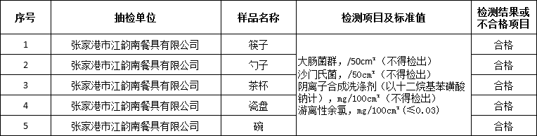 本次監督抽檢共采集碗、瓷盤、茶杯、勺子等樣品各10份,筷子樣品20份,按照GB14934-2016《食品安全國家標準消毒餐(飲)具》規定的要求,委托第三方對大腸菌群、沙門氏菌、陰離子合成洗滌劑、游離性余氯等項目進行了檢測,經檢測,所檢項目全部合格,合格率為100%。現將具體檢測結果情況公告如下: