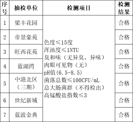 近日,市衛生監督所對現制現售飲用水進行了監督抽檢,共采集7個點位現制現售飲用水14份,按照GB5749-2022《生活飲用水衛生標準》,委托第三方對色度、渾濁度、臭和味、肉眼可見物、pH值、菌落總數、總大腸菌群、高錳酸鹽指數等項目進行檢測,經檢測,7個點位所檢項目均合格,合格率為100%。現將具體檢測結果情況公告如下:
