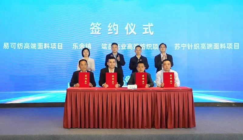 現場,總投資10.5億元的竑昌興業高端紡織、易可紡高端面料、蘇寧針織高端面料3個項目簽約,助力樂余鎮紡織產業提質升級取得新突破。