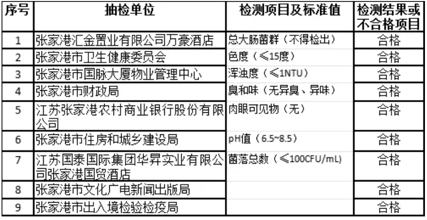 一季度,張家港市衛(wèi)生監(jiān)督所隨機(jī)對二次供水單位進(jìn)行了第一季度抽檢,共采集9家單位樣品9份,按照GB5749-2022《生活飲用水衛(wèi)生標(biāo)準(zhǔn)》,委托張家港市疾控預(yù)防控制中心對總大腸菌群、色度、渾濁度、臭和味、肉眼可見物、pH值、菌落總數(shù)等項目進(jìn)行了檢測,經(jīng)檢測,9家單位所檢項目全部合格,合格率為100%?,F(xiàn)將具體檢測結(jié)果情況公告如下: