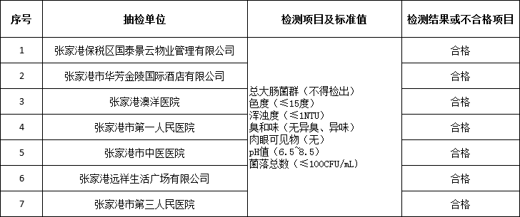 近日,市衛生監督所對部分二次供水進行了第二季度隨機抽檢,共采集7家單位樣品7份,按照GB5749-2022《生活飲用水衛生標準》,委托市疾病預防控制中心對總大腸菌群、色度、渾濁度、臭和味、肉眼可見物、pH值、菌落總數等項目進行了檢測。經檢測,7家單位所檢項目全部合格,合格率為100%。現將具體檢測結果情況公告如下: