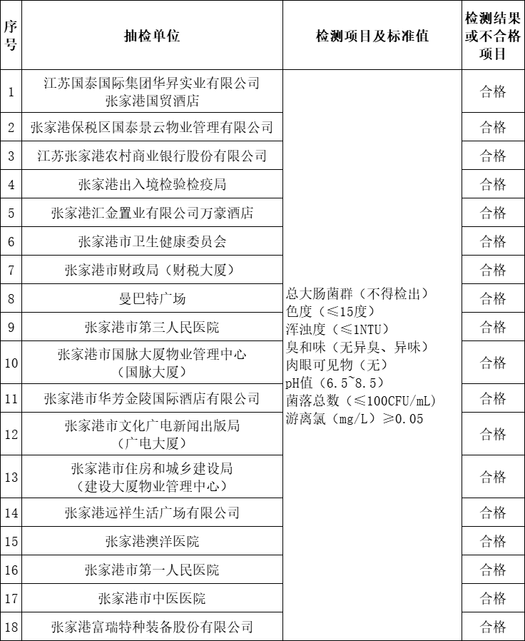 近日,市衛生監督所對二次供水進行了第四季度監督抽檢,共采集18家單位樣品18份,按照GB5749-2022《生活飲用水衛生標準》,委托第三方對總大腸菌群、色度、渾濁度、臭和味、肉眼可見物、pH值、菌落總數、游離氯等項目進行了檢測,經檢測,18家單位所檢項目全部合格,合格率為100%。現將具體檢測結果情況公告如下: