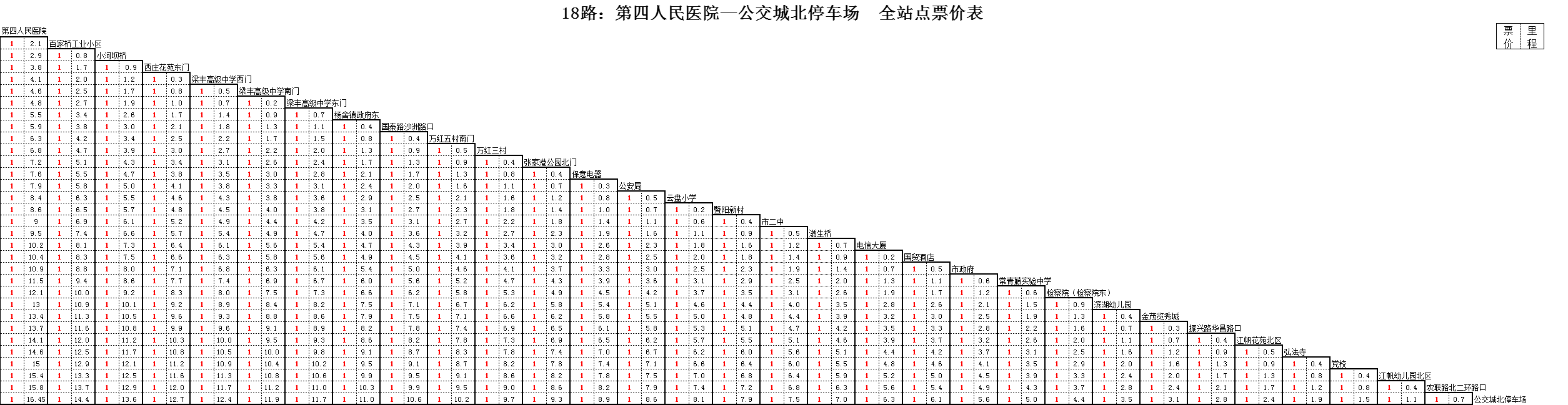 附件:18路:第四人民醫院—公交城北停車場全站點票價表
