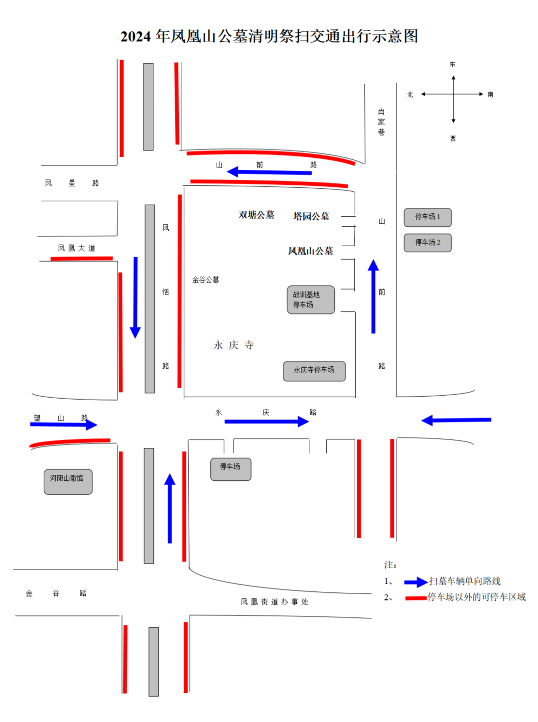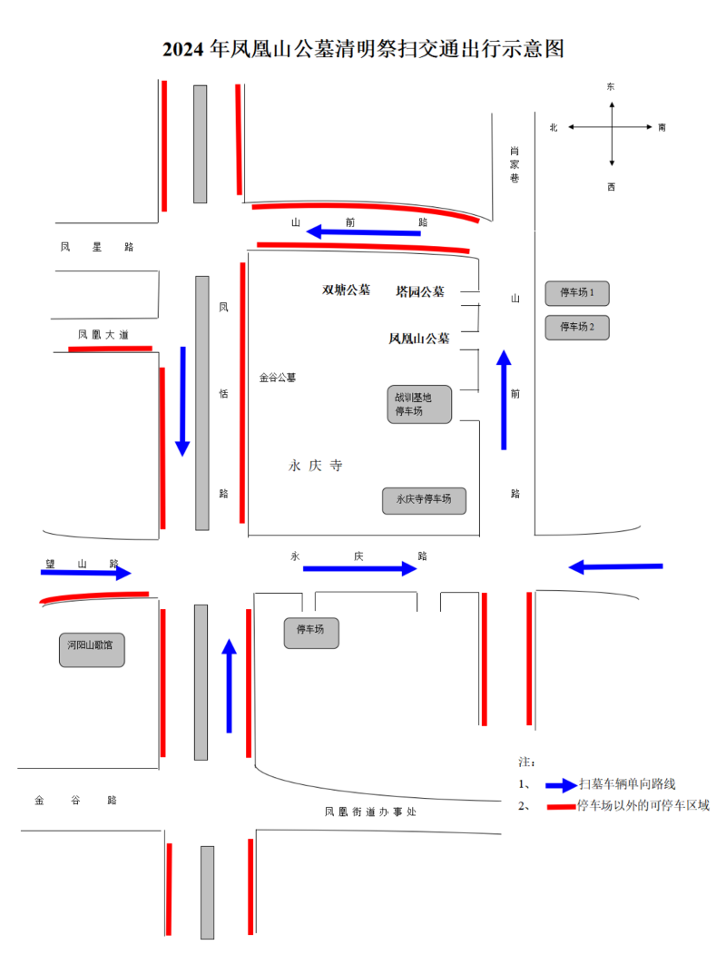 為緩解道路交通壓力、減少擁堵,提倡市民采用綠色低碳的出行方式。同時,清明期間我鎮將對鳳凰山墓區周邊實行交通管制(4月3日-4月4日實行單向通行,其余時間段視交通情況進行管制)。機動車從鳳恬路永慶路口進,通過山前路單向繞行,由鳳恬路環山公路出口駛出。