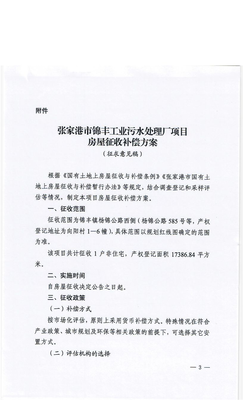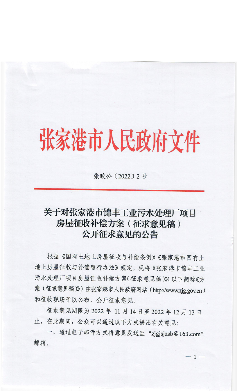 關于對張家港市錦豐工業污水處理廠項目房屋征收補償方案(征求意見稿)公開征求意見的公告