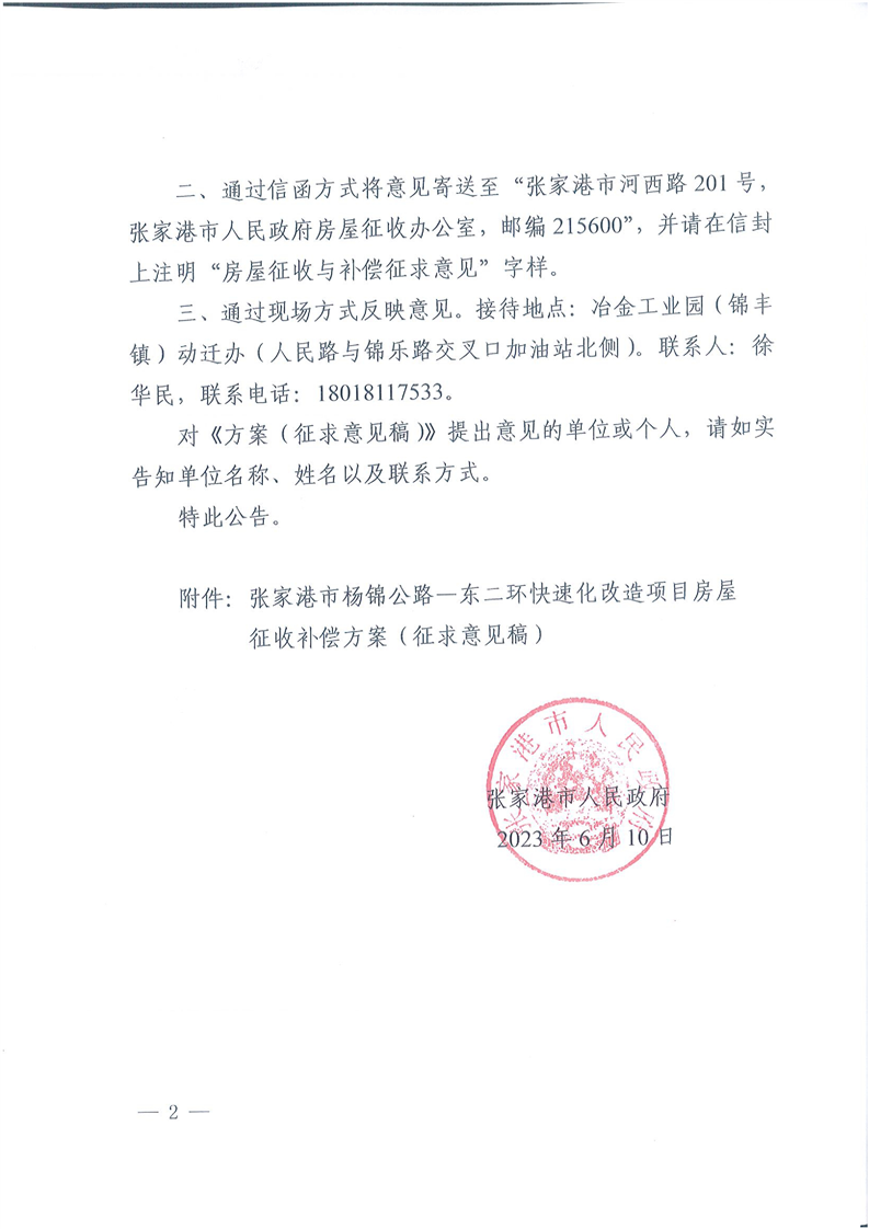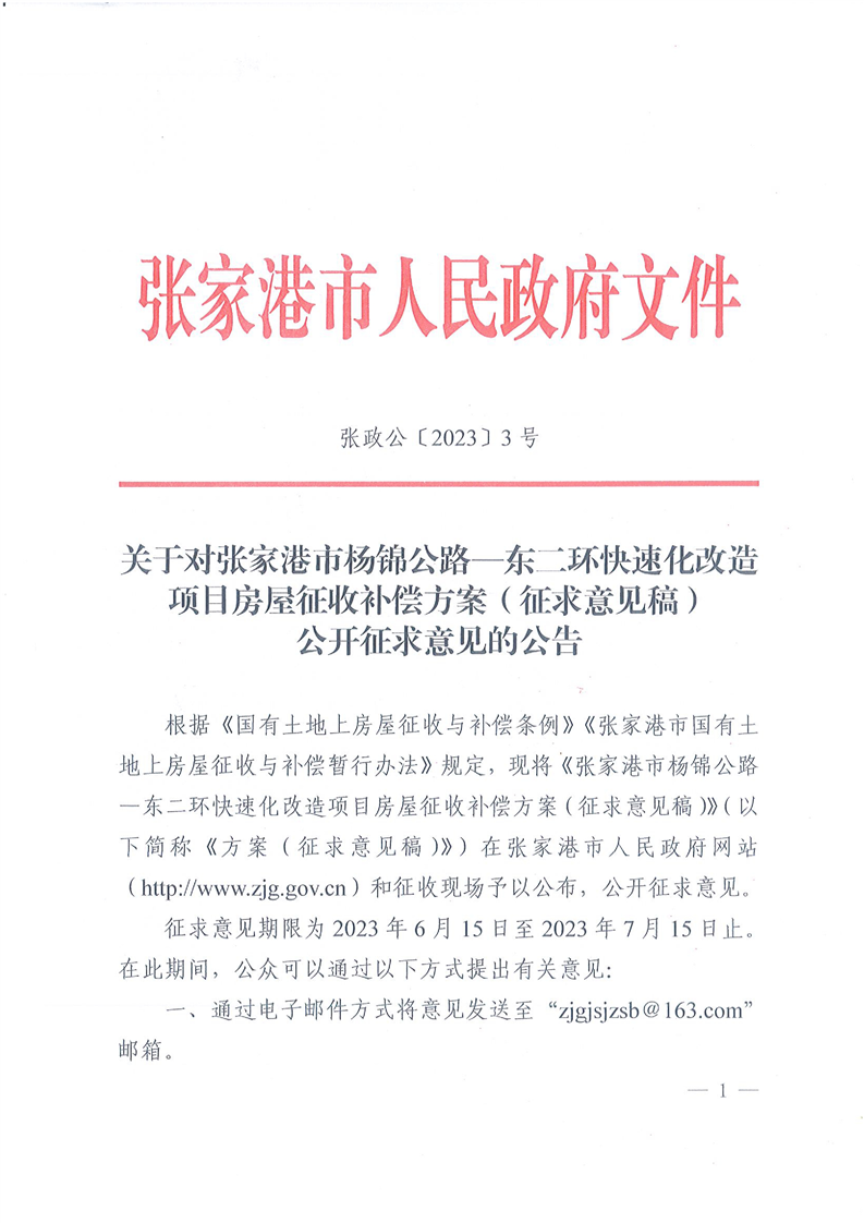 關(guān)于對張家港市楊錦公路——東二環(huán)快速化改造項目房屋征收補償方案(征求意見稿)公開征求意見的公告