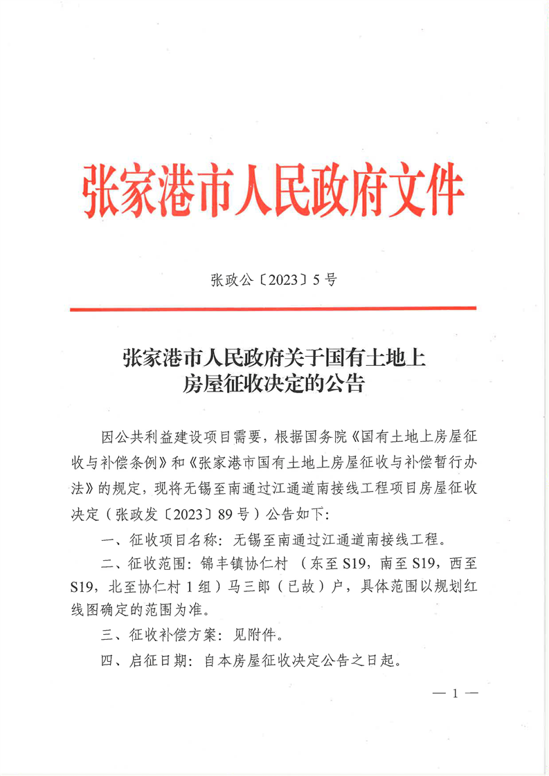 張家港市人民政府關于國有土地上房屋征收決定的公告
