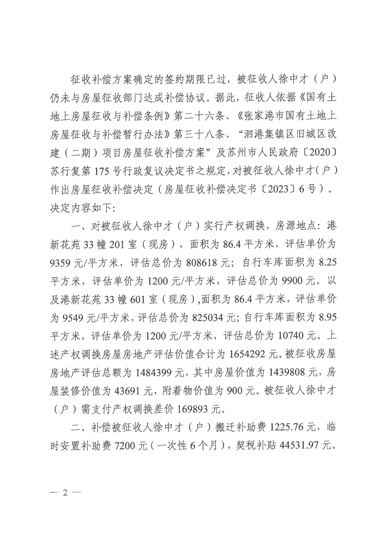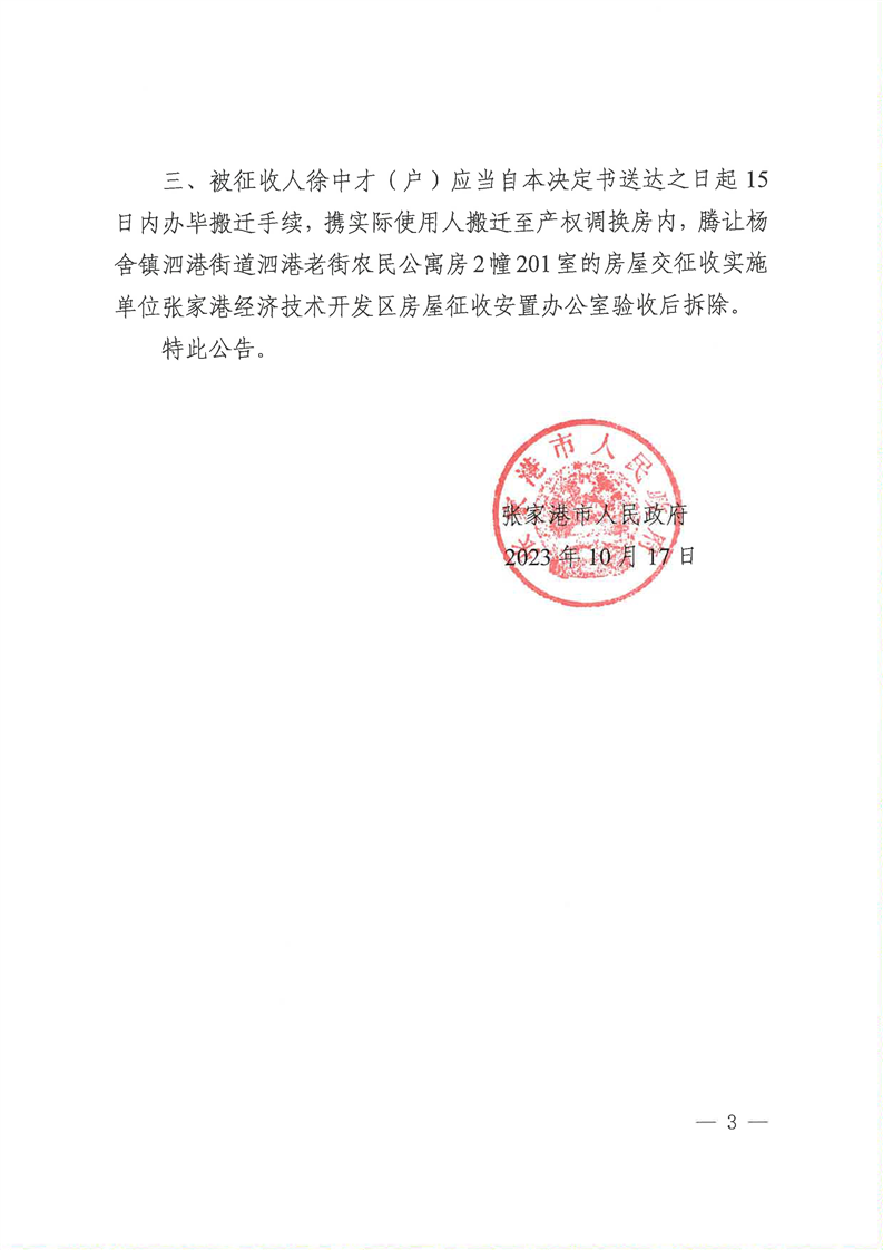 張家港市人民政府關于楊舍鎮泗港老街農民公寓房2幢201室被征收人徐中才(戶)房屋征收補償決定的公告