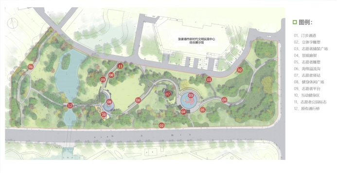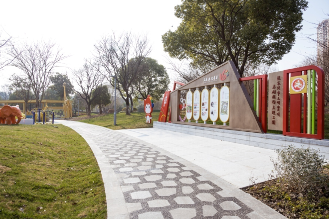 該主題公園位于張家港文化中心南側,提升改造面積約1.4萬平方米。作為港城文化中心的配套休閑場地,項目在規劃建設初期,從城市文化片區發展的角度出發,結合現狀優劣及屬性,以延續文明建設和宣傳功能為設計考慮的重點,通過空間重塑、文化宣傳、場景打造和生態融入等策略,滿足志愿者服務文化宣傳,兼顧公園休閑功能,實現精神文明與市民生活結合、與自然生態結合,讓綠地重新煥發生機。
