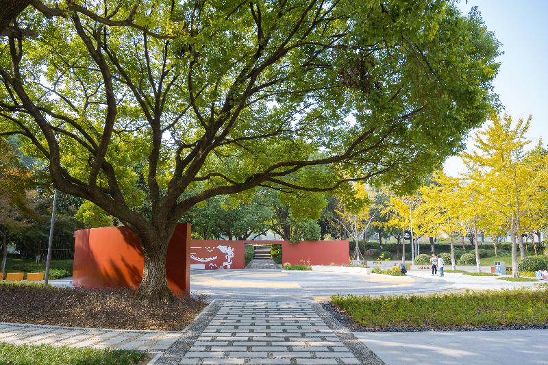橙色的“聽聽風(fēng)”主題標(biāo)志靚麗吸睛,白色的紙飛機(jī)雕塑活潑動感。港城大道與通運(yùn)路交叉口西南側(cè),又一“樟小園”煥新開園。