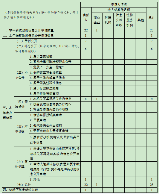 2.政府信息依申請公開辦理情況。2022年度,新收到政府信息公開申請共計23件,上年度結轉1件,其中自然人申請共23件,商業企業為1件。截止2022年底,共辦結23件,1件結轉下一年度繼續辦理。本年度處理結果包括:予以公開7件;部分公開6件;本機關無法提供9件;其他(當事人撤回政府信息公開申請)1件。本年度政府信息公開有1件行政復議,未提起行政訴訟。