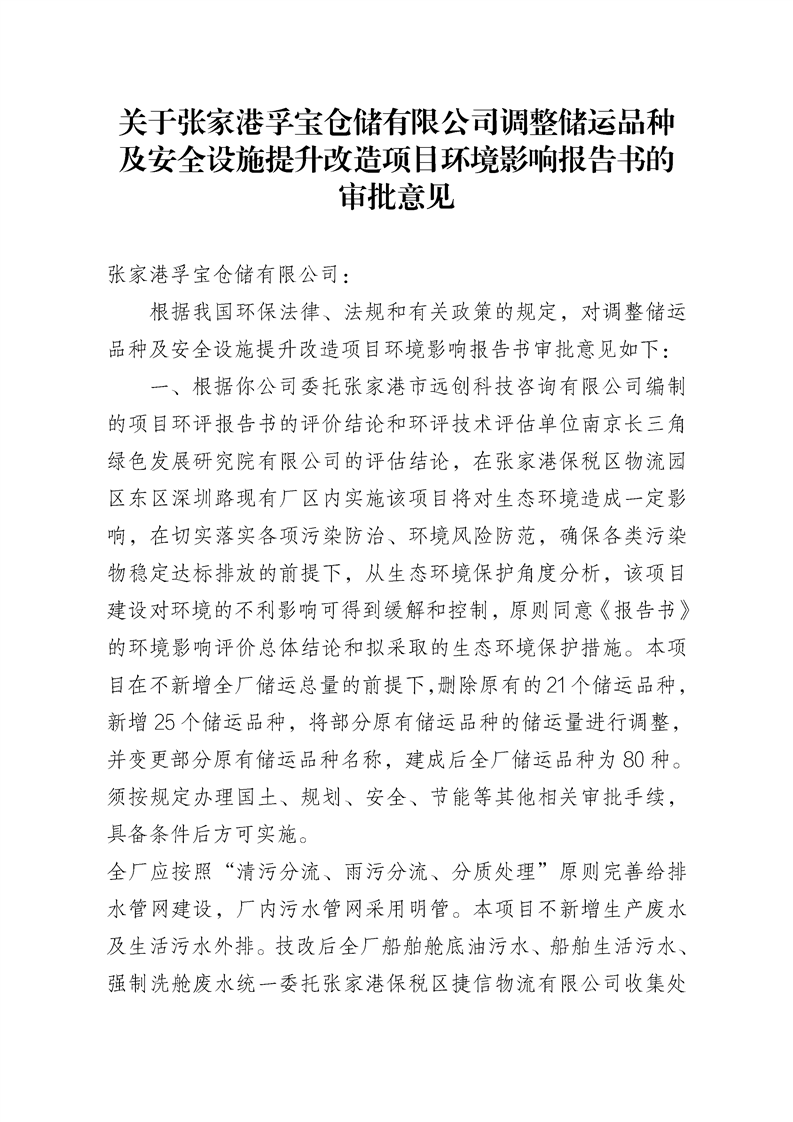 關于張家港孚寶倉儲有限公司調整儲運品種及安全設施提升改造項目環境影響報告書的審批意見 |