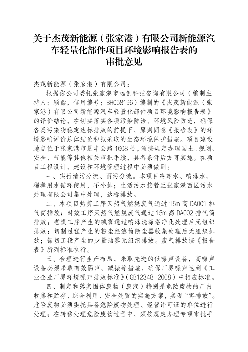 關(guān)于杰茂新能源(張家港)有限公司新能源汽車輕量化部件項(xiàng)目環(huán)境影響報(bào)告表的審批意見 |
