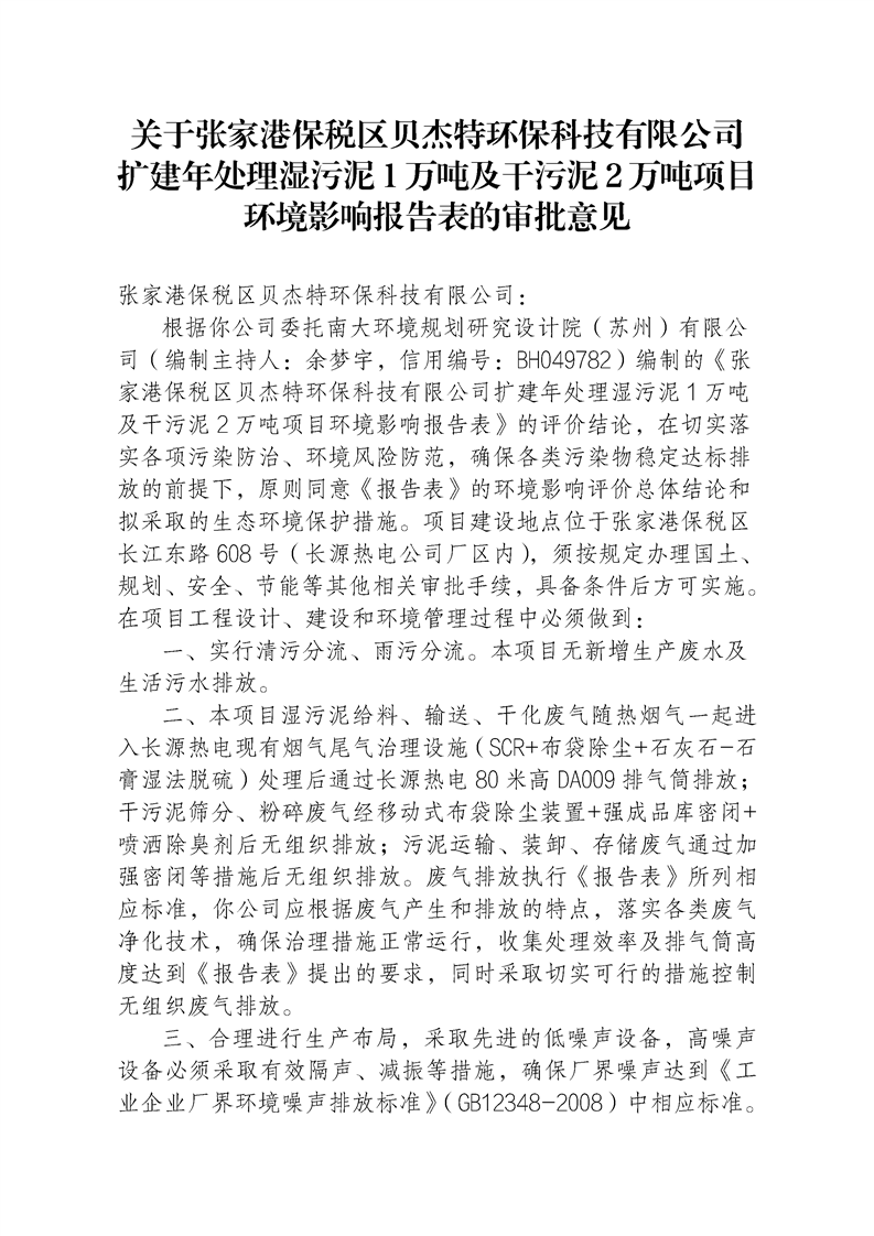 關于張家港保稅區貝杰特環保科技有限公司擴建年處理濕污泥1萬噸及干污泥2萬噸項目環境影響報告表的審批意見 |