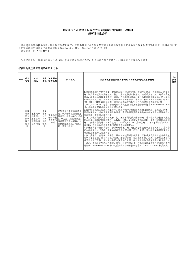 張家港市長江防洪工程管理處南苑路南河水體調蓄工程項目擬環評審批公示