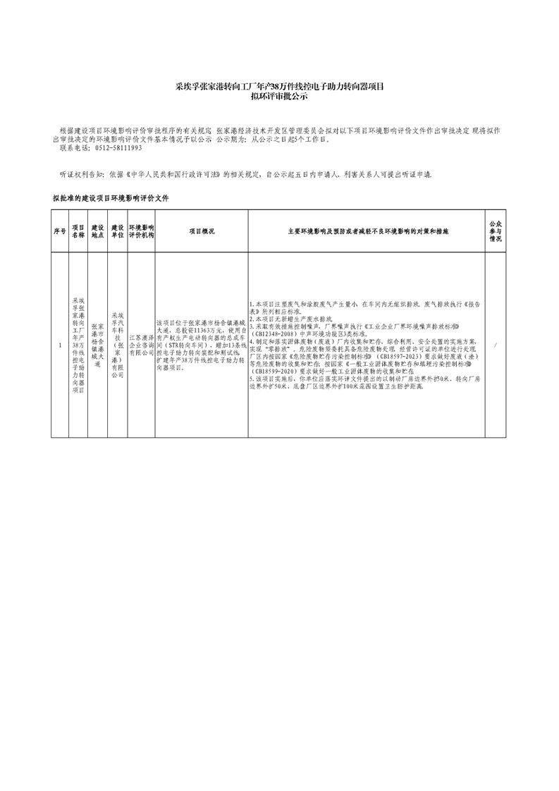 采埃孚張家港轉(zhuǎn)向工廠年產(chǎn)38萬(wàn)件線控電子助力轉(zhuǎn)向器項(xiàng)目擬環(huán)評(píng)審批公示