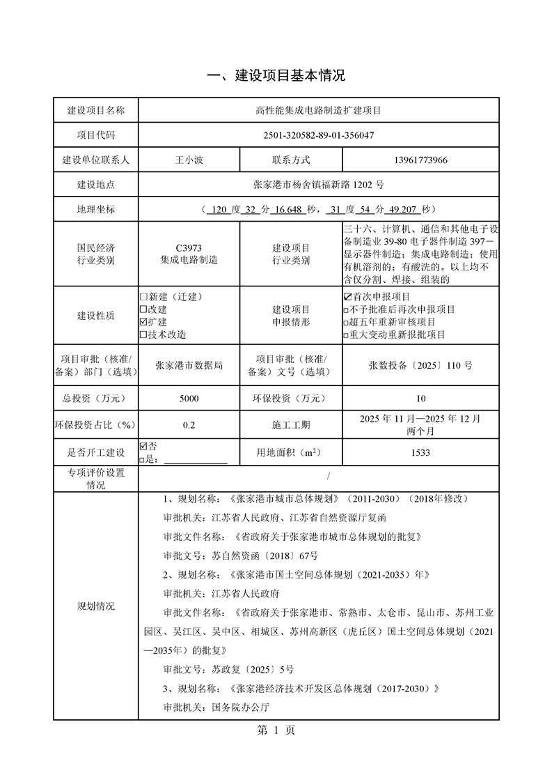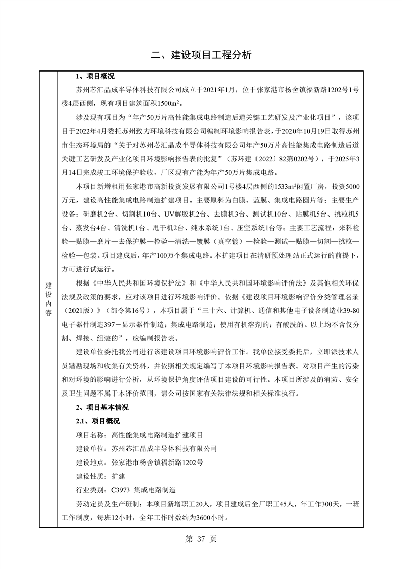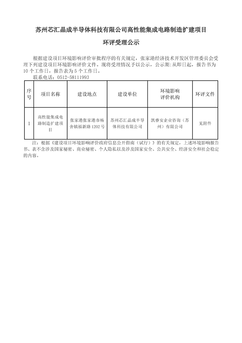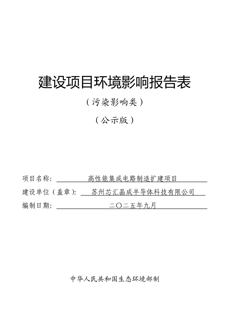 蘇州芯匯晶成半導體科技有限公司高性能集成電路制造擴建項目環評受理公示