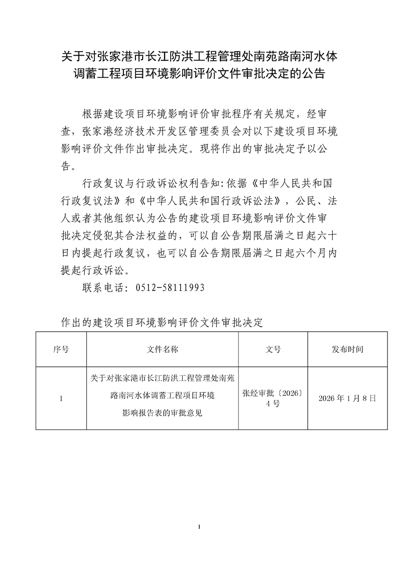 關(guān)于對張家港市長江防洪工程管理處南苑路南河水體調(diào)蓄工程項目環(huán)境影響評價文件審批決定的公告