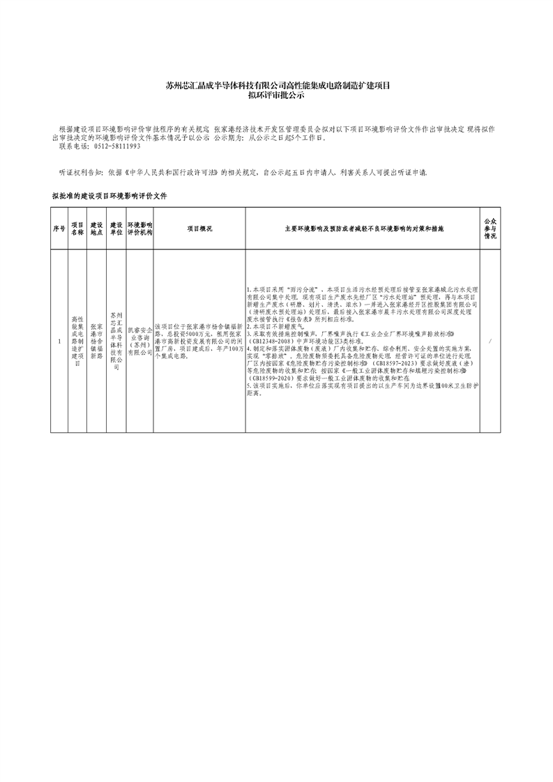 蘇州芯匯晶成半導體科技有限公司高性能集成電路制造擴建項目擬環評審批公示