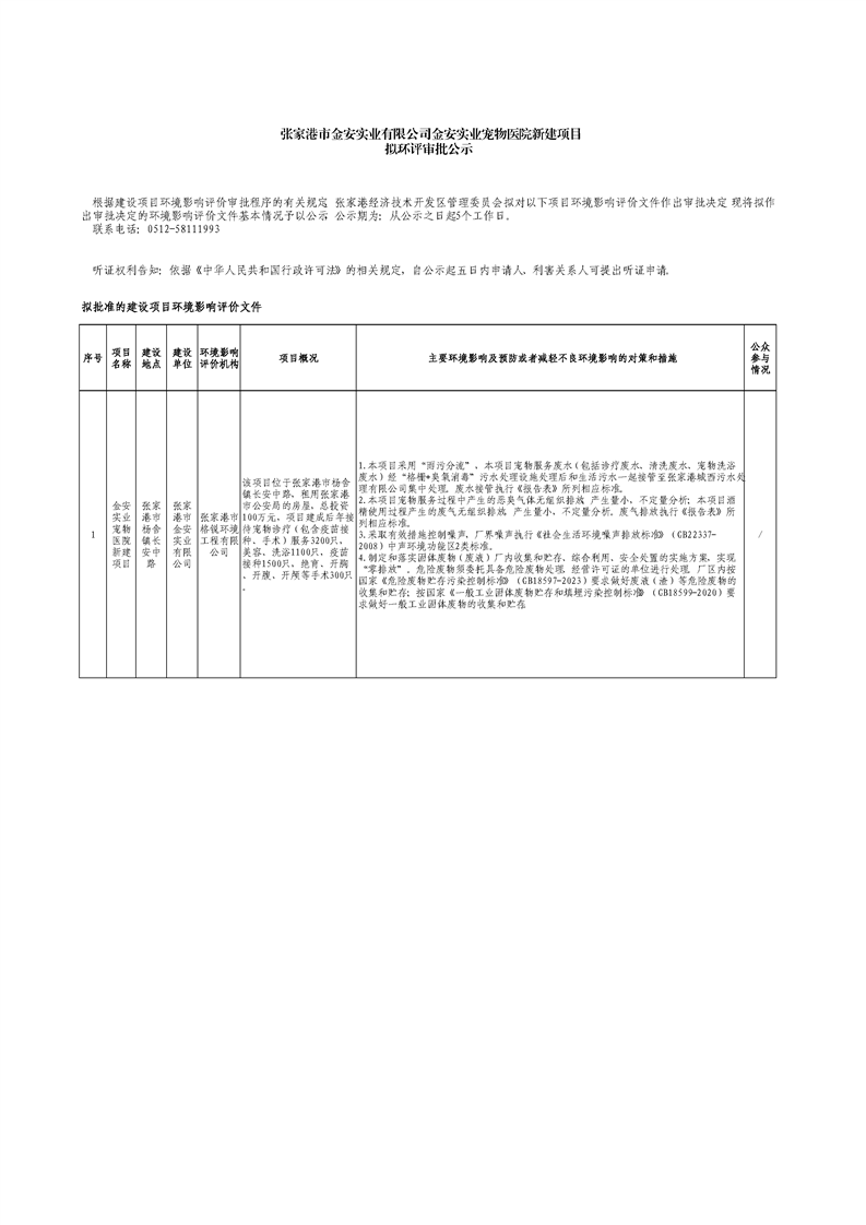 張家港市金安實業有限公司金安實業寵物醫院新建項目擬環評審批公示