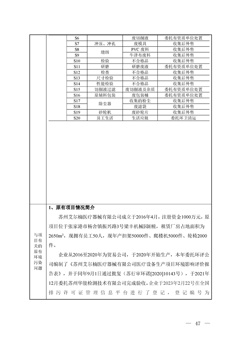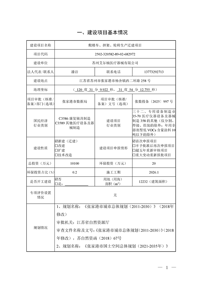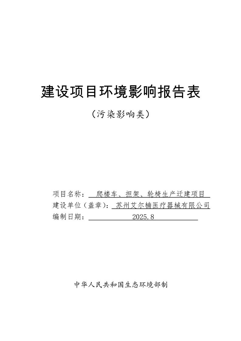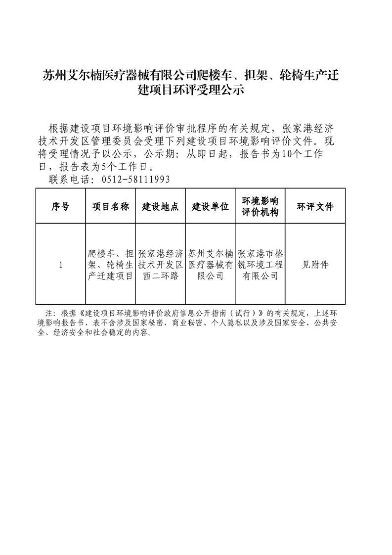 蘇州艾爾楠醫療器械有限公司爬樓車、擔架、輪椅生產遷建項目環評受理公示