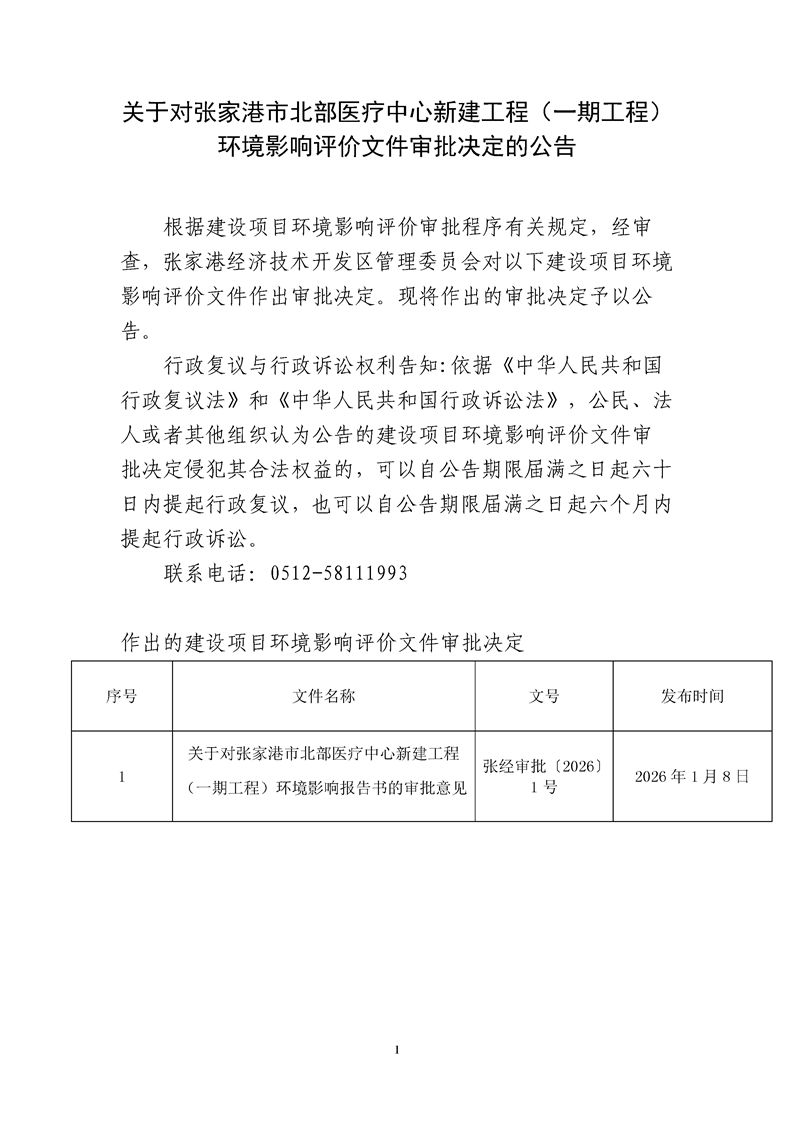 關于對張家港市北部醫療中心新建工程(一期工程)環境影響評價文件審批決定的公告