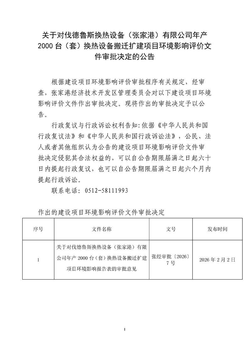 關(guān)于對伐德魯斯換熱設(shè)備(張家港)有限公司年產(chǎn)2000臺(套)換熱設(shè)備搬遷擴(kuò)建項目環(huán)境影響評價文件審批決定的公告
