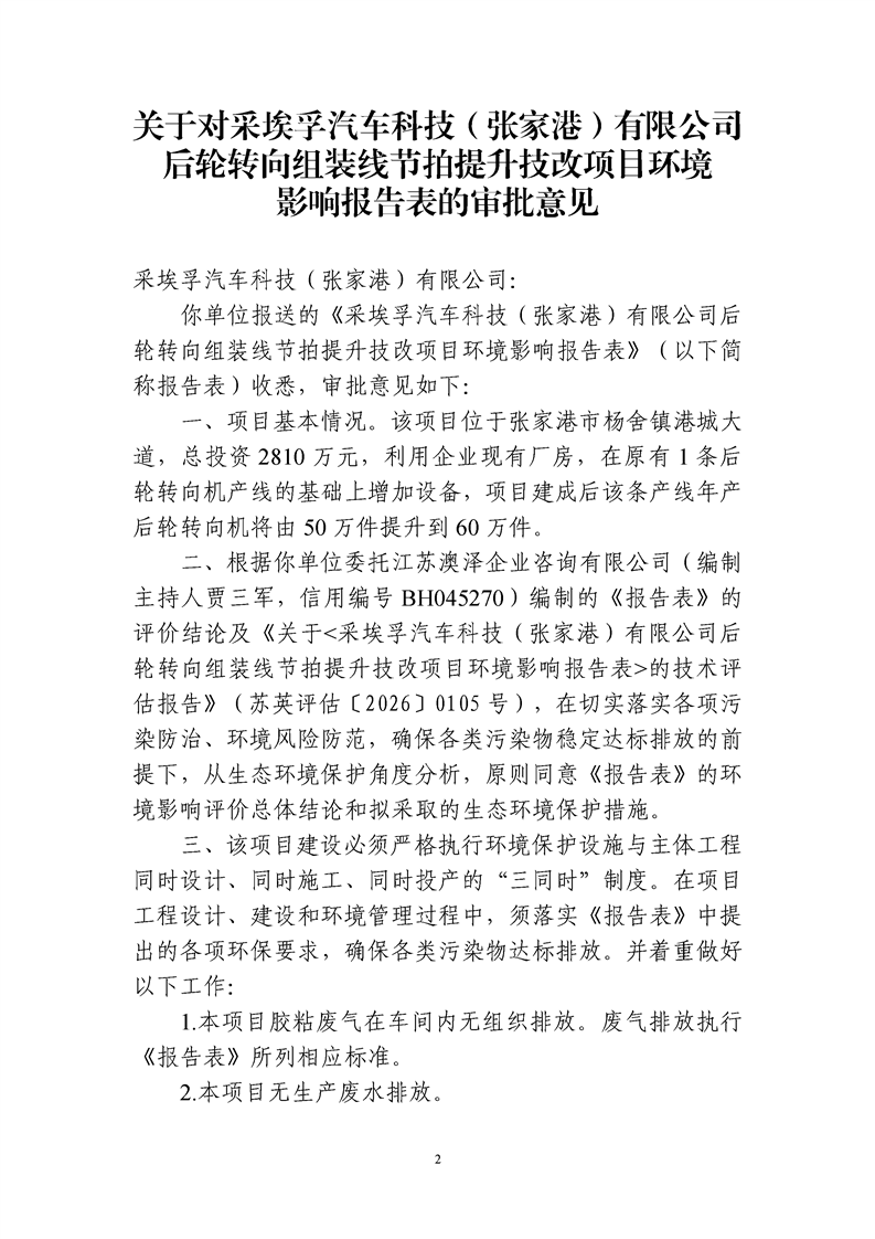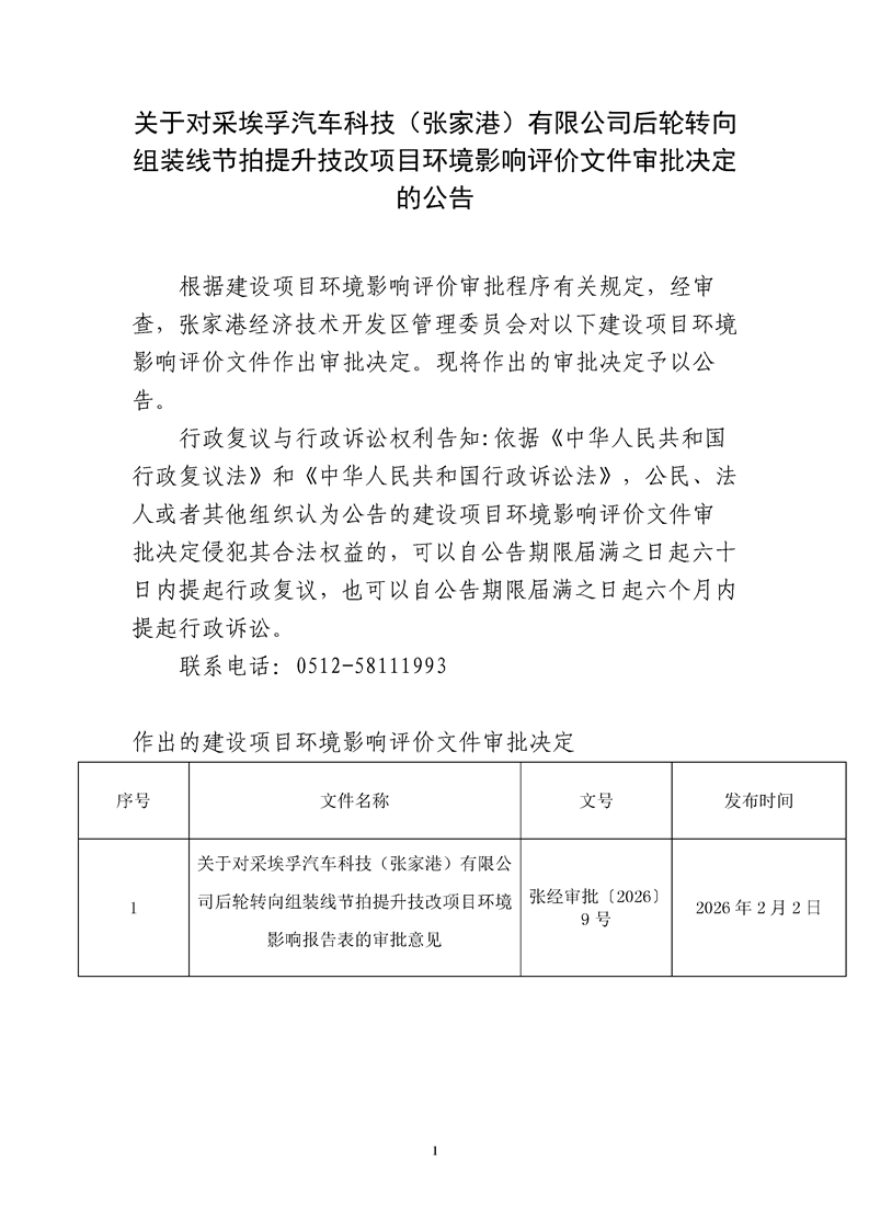 關于對采埃孚汽車科技(張家港)有限公司后輪轉向組裝線節拍提升技改項目環境影響評價文件審批決定的公告