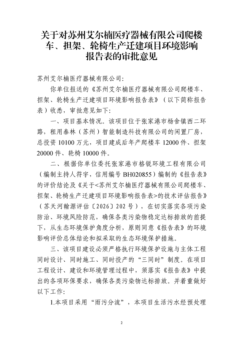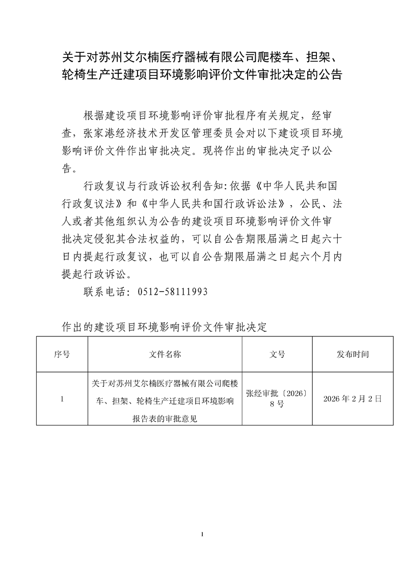 關(guān)于對蘇州艾爾楠醫(yī)療器械有限公司爬樓車、擔(dān)架、輪椅生產(chǎn)遷建項(xiàng)目環(huán)境影響評價(jià)文件審批決定的公告