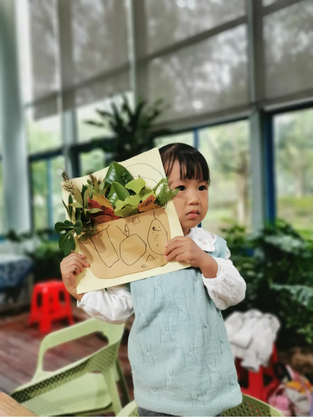 在繪本《落葉跳舞》中,孩子們發現了樹葉的秘密。孩子們和家長一起在生態園里撿到了秋天的落葉,做成手工。