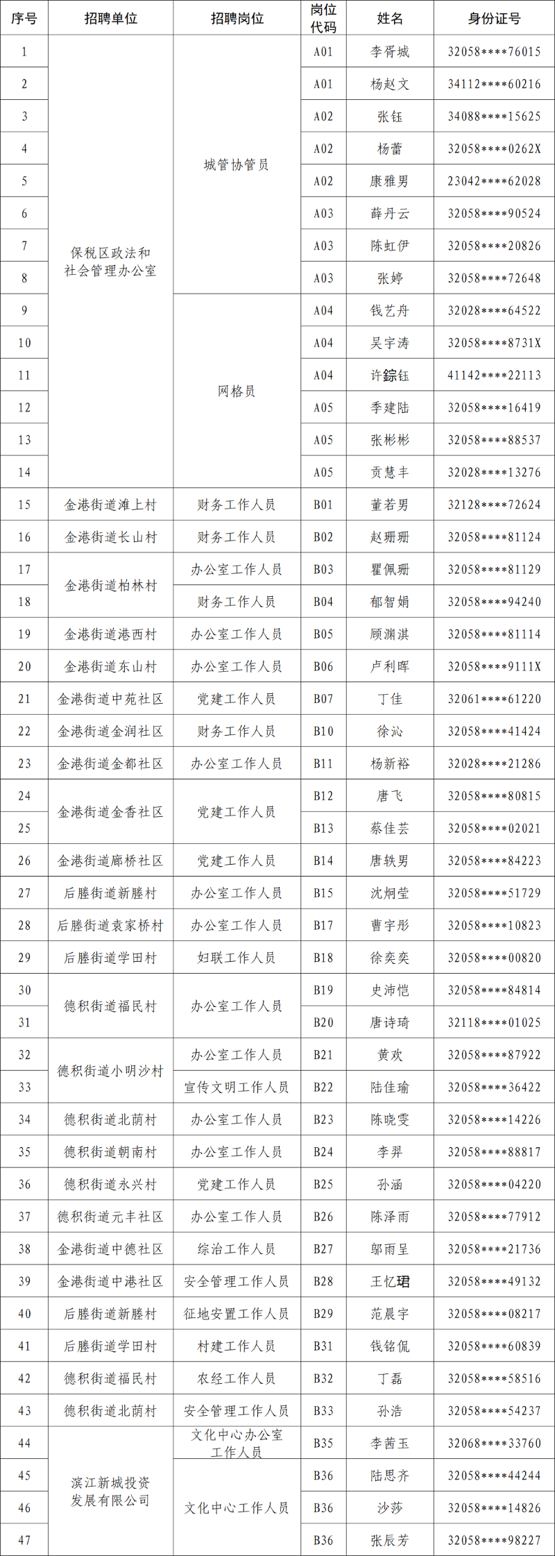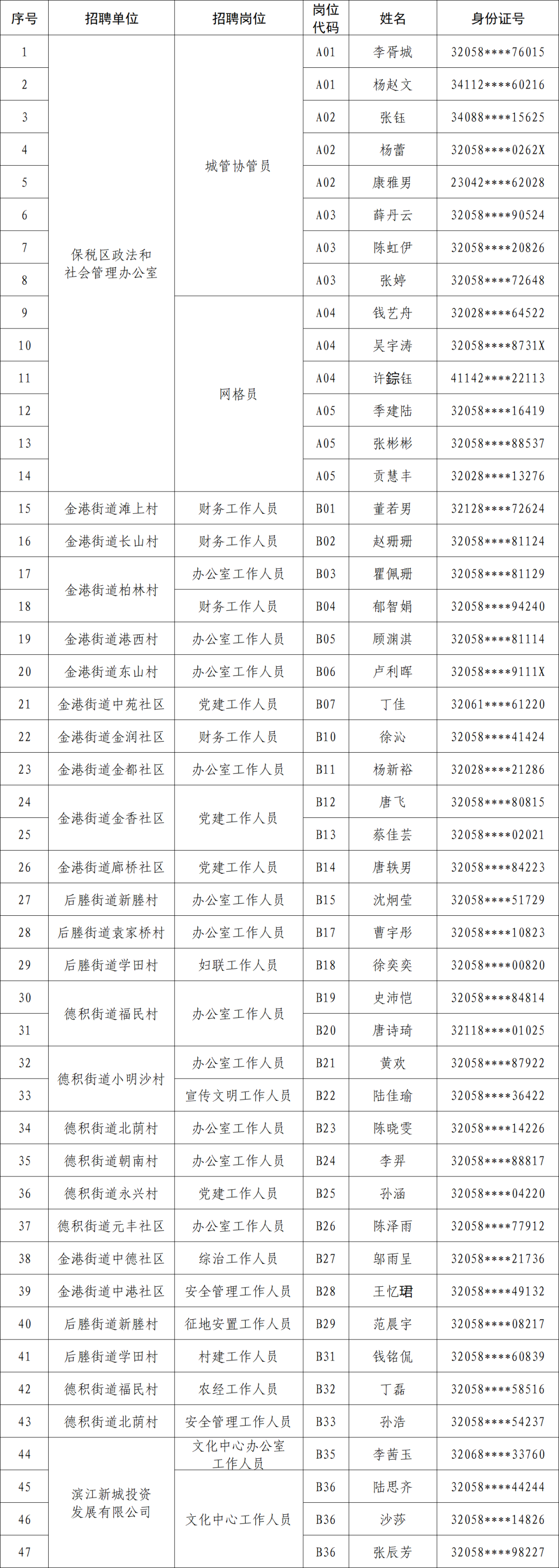 根據《張家港保稅區、金港、后塍、德積街道有關單位2023年公開招聘工作人員公告》、《2023年張家港保稅區公開招聘公益性崗位(編外)人員公告》,經筆試(人崗相適度測評)、面試、體檢、考察(政審)等程序,現對以下擬錄用人員予以公示。