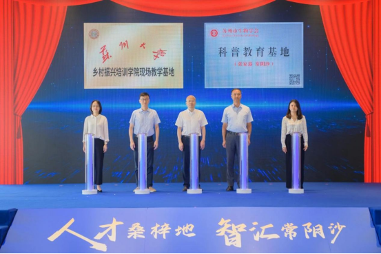 下面,進行蘇州大學鄉村振興培訓學院現場教學基地、蘇州市生物學會(張家港常陰沙)科普教育基地揭牌儀式。有請張家港市副市長蔣新峰,蘇州大學繼續教育學院副院長、鄉村振興培訓學院副院長沈曄,蘇州市生物學會理事長蘇雄,張家港市科學技術協會主席戴艷,常陰沙現代農業示范園區黨工委副書記、管委會主任牛楠上臺,共同開啟合作的新篇章。