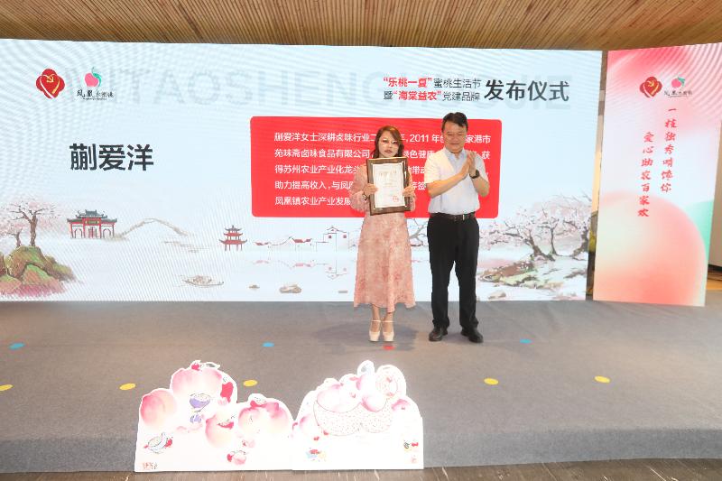 蒯愛洋女士深耕鹵味行業二十余年,2011年創立張家港市苑味齋鹵味食品有限公司,以打造綠色健康食品為目標,獲得蘇州農業產業化龍頭企業稱號。她帶動幫扶農戶35名,助力提高收入,與鳳凰山桃業合作社等簽訂供銷合同,助推鳳凰鎮農業產業發展。讓我們有請鳳凰鎮人大主席 張平 為蒯愛洋女士頒獎,再次為他們響起掌聲!
