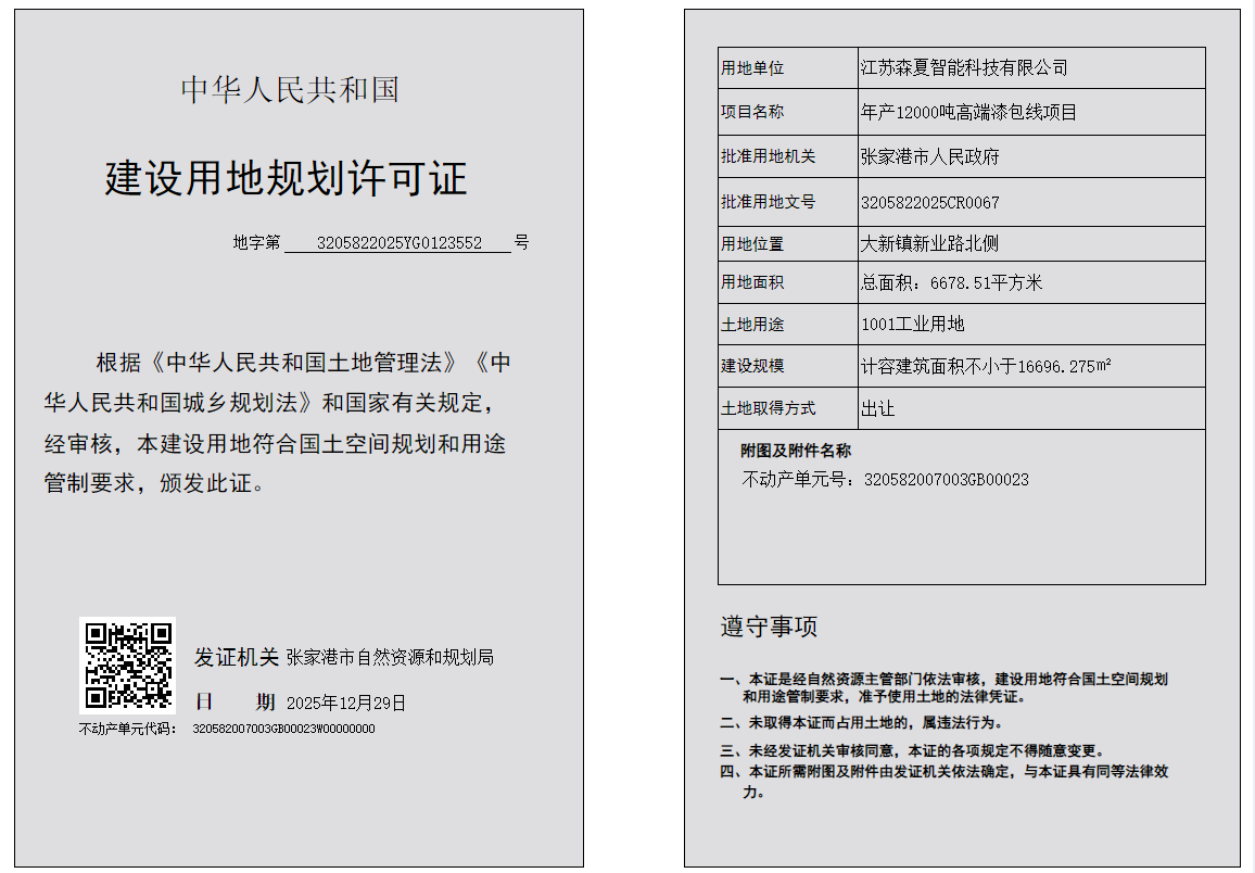 建設(shè)用地規(guī)劃許可證:江蘇森夏智能科技有限公司年產(chǎn)12000噸高端漆包線項(xiàng)目