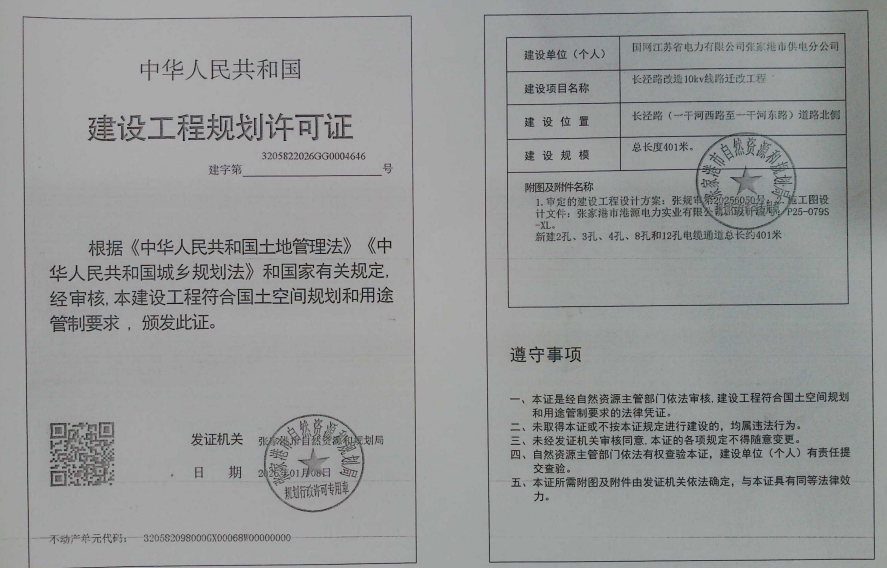 建設工程規劃許可證:國網江蘇省電力有限公司張家港市供電分公司長涇路改造10kw線路遷改工程