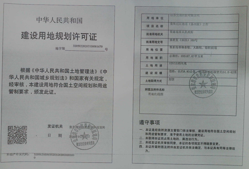 建設用地規劃許可證:江蘇交通控股有限公司張皋過江通道(蘇州段)工程