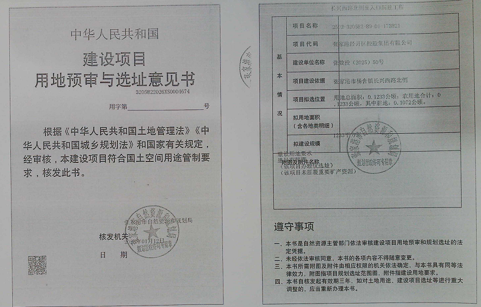 建設項目用地預審與選址意見書:張家港經開區控股集團有限公司長興西路北側出入口新建工程